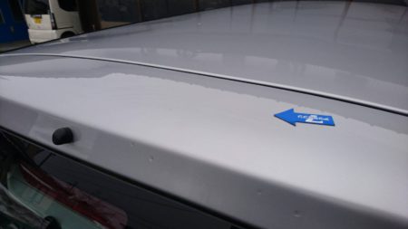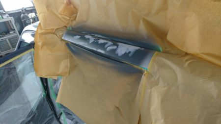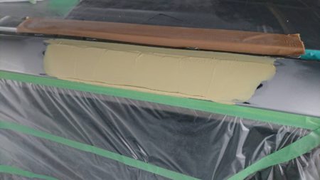 ▼バックドアの上部は板金したら、パテというものを塗ります。