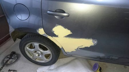 ある程度凹みを戻したら、パテという粘土状の塗料を塗ります。