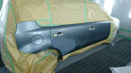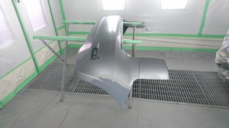 塗装ブースへ移動し、上塗り塗装に入ります。