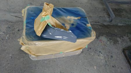 カラーベース塗装のあとに、透明なベースと硬化剤を混ぜてクリア塗装します。