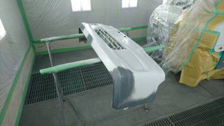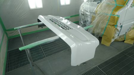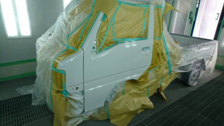 塗装ブースへ移動し、上塗り塗装に入ります。