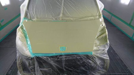 お車にホコリやゴミが付着しないように塗装ブースに移動させます。