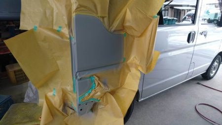 ▼パテ研磨が終わったら周辺をマスキングしてサフェーサーという